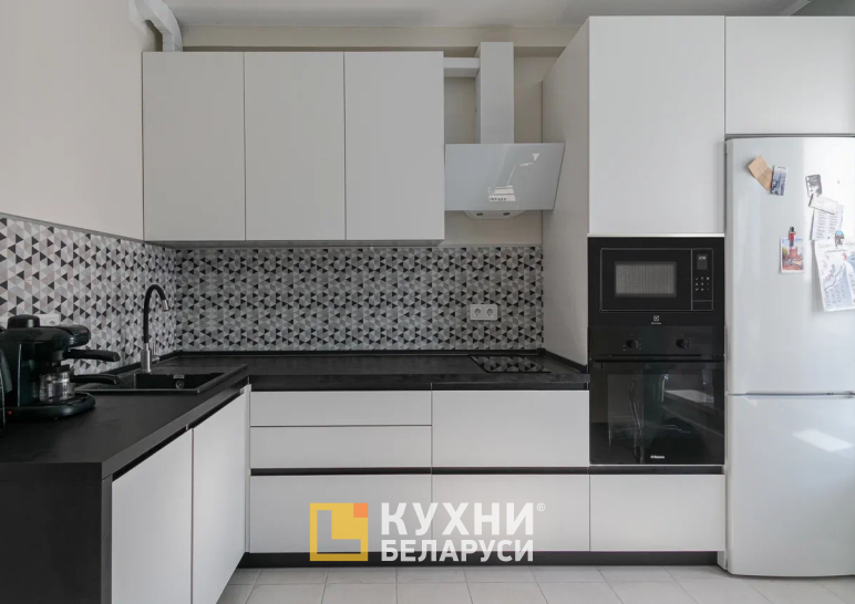Дизайн гарнитура выполнен в стиле модерн. Гладкие матовые фасады, отсутствие декора и выступающих ручек подчеркивают лаконичность и современность комплекта. Белая поверхность мебели делает пространство более «воздушным» и светлым. Столешница цвета Вулкано создает акцент и гармонично дополняет композицию. В таком же цвете выполнена нижняя боковая сторона гарнитура.