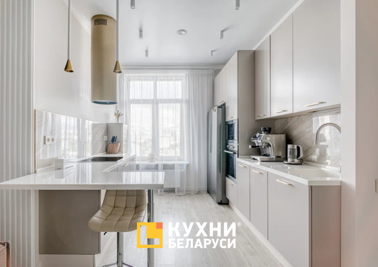 Гарнитур выполнен в светло-бежевом цвете. Он делает пространство более воздушным, легким. Дополняют его золотистые ручки-рейлинги и фартук под мрамор. Закрытые матовые фасады сочетаются с глянцевой столешницей и стеклянной створкой в витрине.
